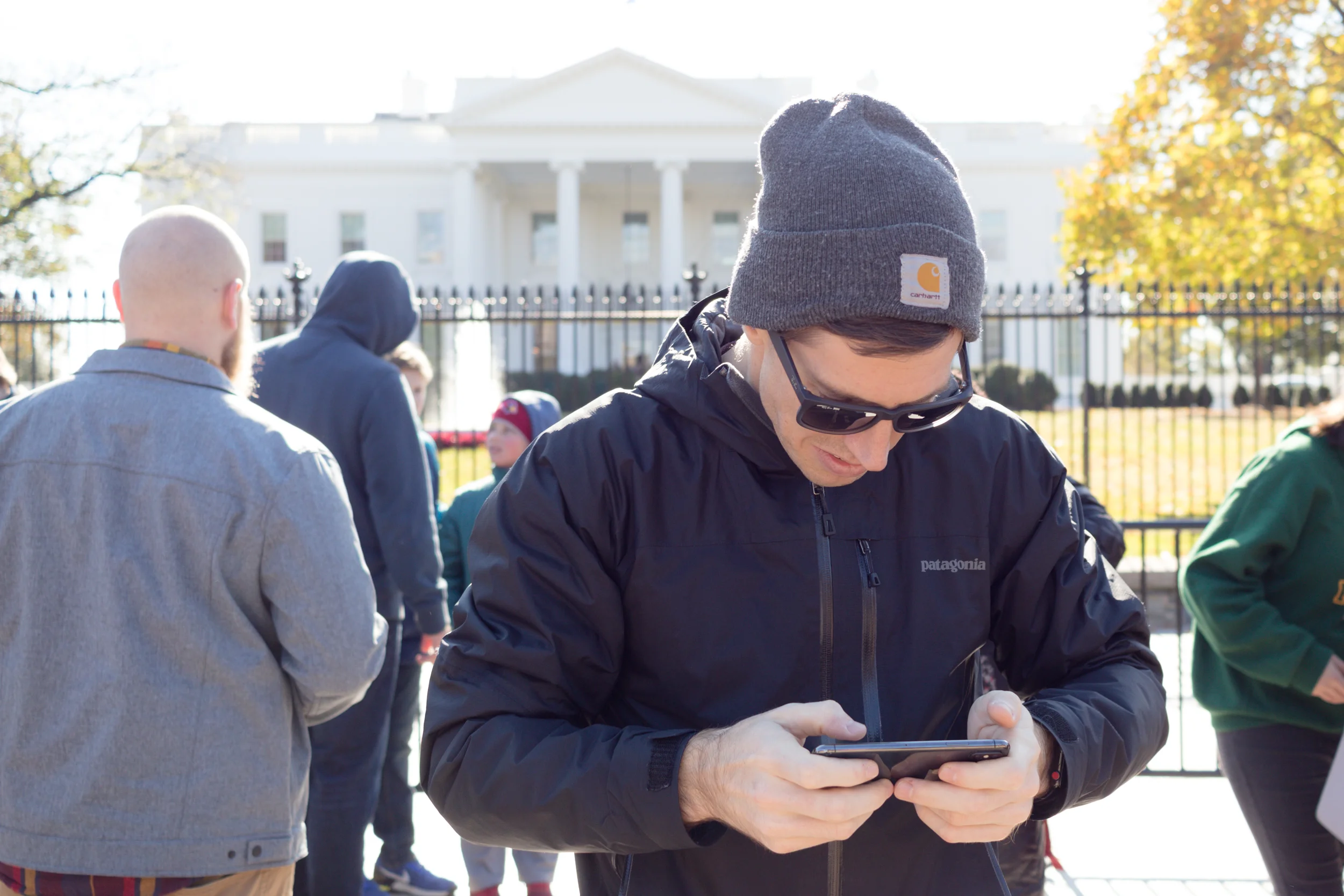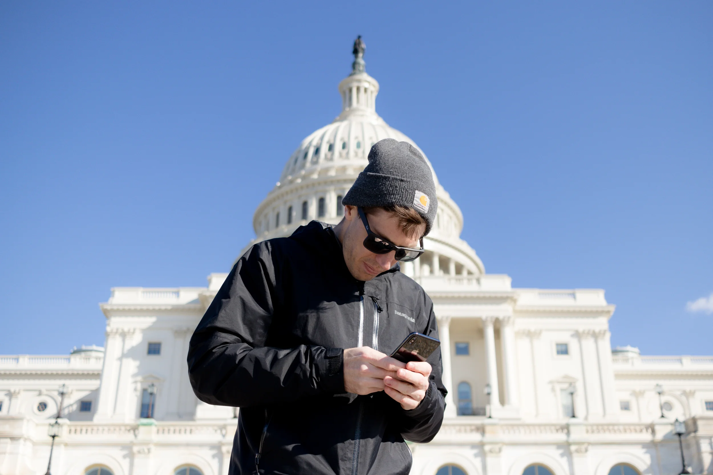 Shay on his phone in front of an important government building (Photo 1 of 3)