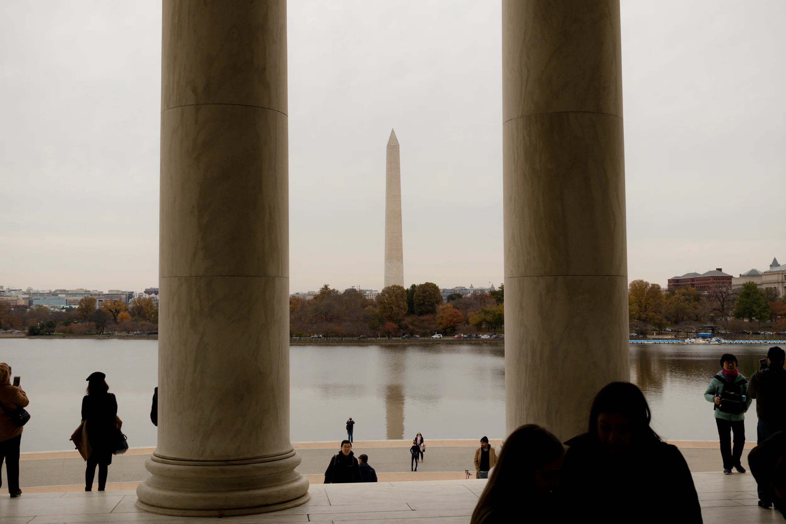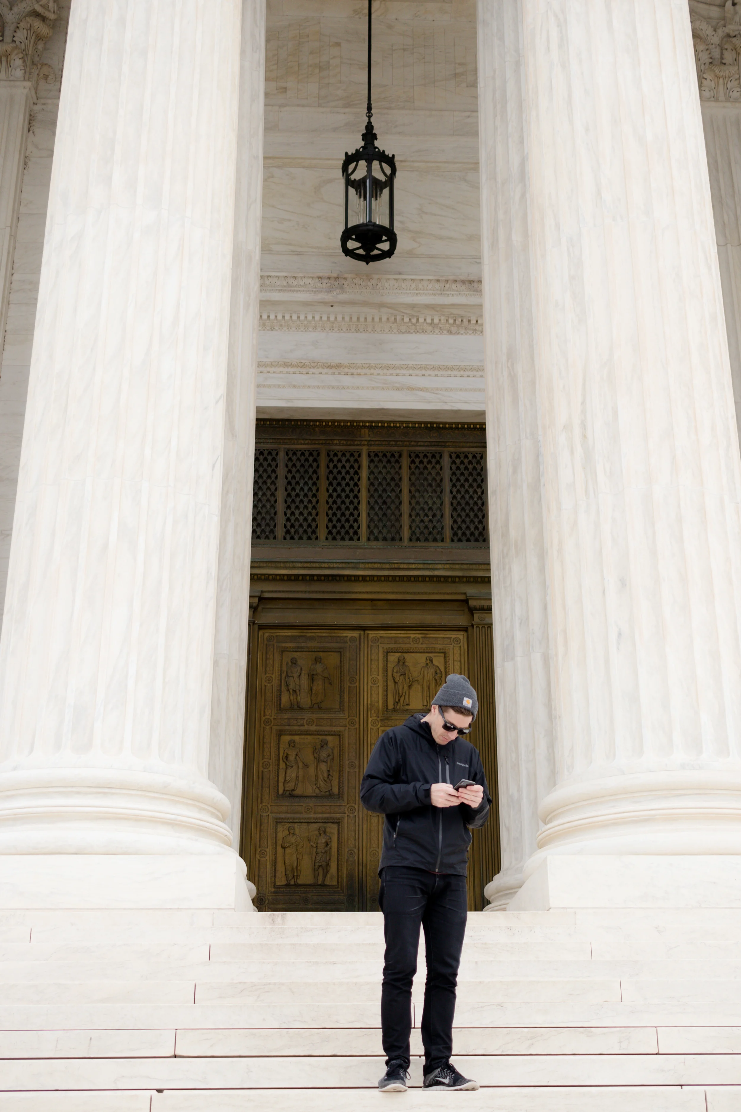 Shay on his phone in front of an important government building (Photo 2 of 3)